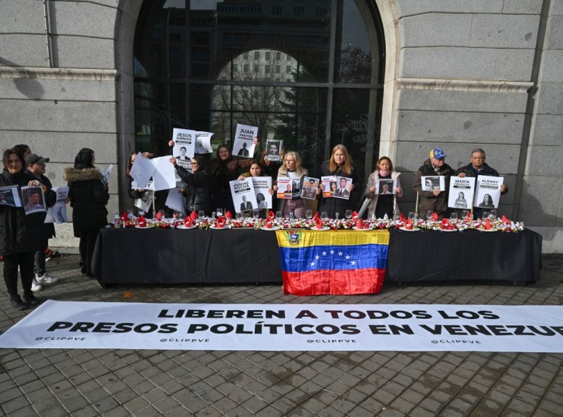 La diáspora venezolana dispuso este domingo en una calle de Madrid una larga mesa con los adornos habituales de la Navidad y algunos de los nombres de los presos políticos venezolanos que no podrán celebrar las fiestas con sus familiares y seres queridos.