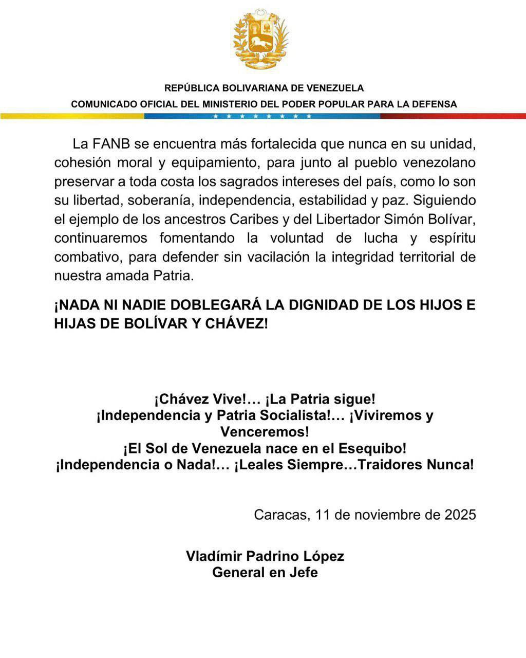 En el comunicado se explicó que estas maniobras forman parte de “una fase superior del Plan Independencia 200”, un despliegue militar que Venezuela activó el pasado septiembre en defensa del territorio.