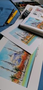 -Aprovecho para tomar fotografías, dibujar o pintar el entorno. Siempre estoy aprendiendo de algún artista, estudiando su obra o realizando algún curso corto. Me he especializado en el dibujo urbano y la acuarela. Es una técnica muy bonita, pero complicada a la vez, ya que el agua es quien manda en el papel; es necesario aprender a dominarla o a dejar que haga su trabajo.