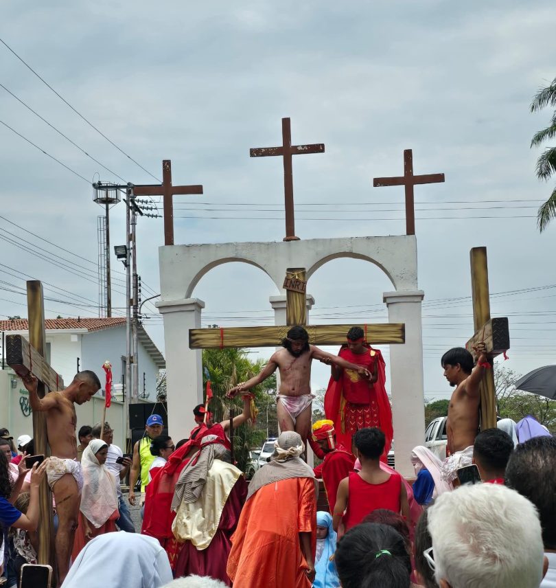 El viacrucis comenzó a las 10:30 a. m., en el santuario que hacía de rol del calvario, donde inició el recorrido de las 14 estaciones santas, que culminó en el sector Las Tres Cruces, en el monumento creado para escenificar este momento.