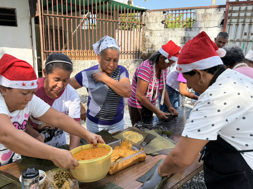 Son alrededor de tres a cuatro días activos en la preparación de las hallacas. Este año, lograron recolectar 150 kilos de hojas de plátano, 40 pollos, 25 kg de carne de res y 20 kg de carne de cerdo, además de aceitunas, pasas, alcaparras y la harina de maíz donada por Alimentos Doña Emilia.