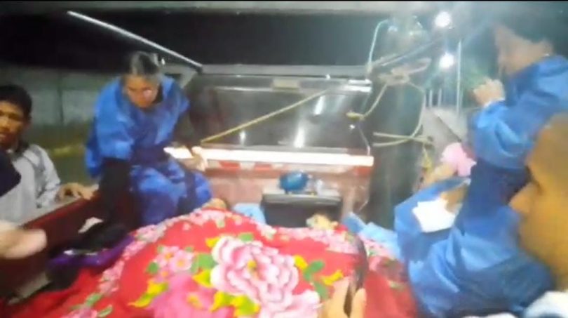En las imágenes se ve a una mujer y a una adolescente acostadas en la parte trasera del vehículo, acompañadas por personal de salud, pero sin ningún tipo de medidas de seguridad ni las condiciones mínimas que requiere el traslado de pacientes lesionados.