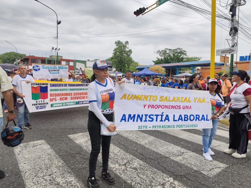 Trabajadores activos, jubilados, docentes y empleados de la administración pública marcharon en Acarigua desde el bulevar San Roque hasta la plaza Bolívar, acompañados por un contingente de la Policía del estado que resguardó el orden público durante la movilización.