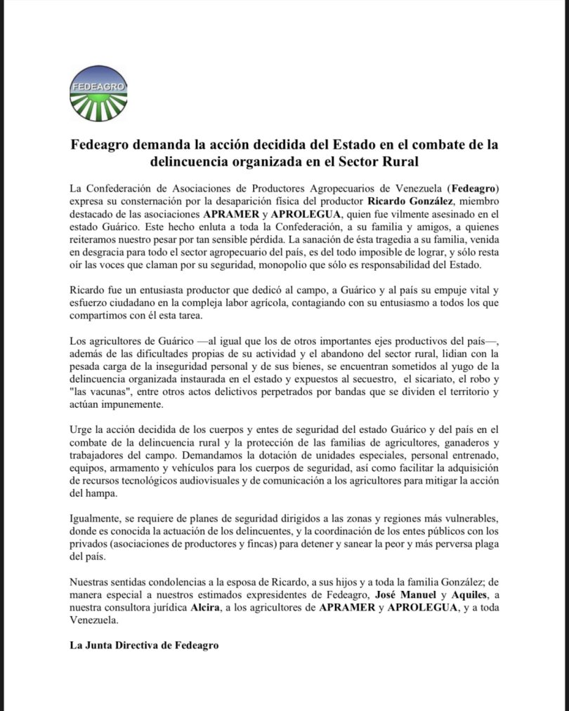 Acarigua.- La Confederación de Asociaciones de Productores Agropecuarios de Venezuela (Fedeagro) emitió un enérgico comunicado para expresar su consternación y rechazo ante el asesinato del productor Ricardo González, miembro destacado de las asociaciones Apramer y Aprolegua, en el estado Guárico.